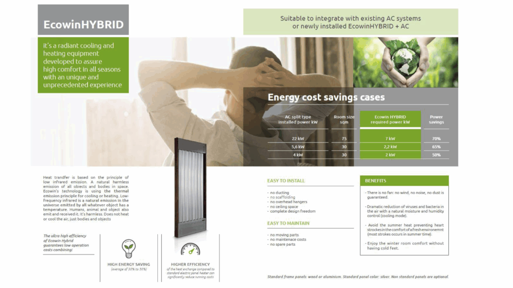 Ecowin is a radiant air conditioning system that is easy for both the earth and people to use our proprietary technology. In the hot summer, it has a refreshing feeling like in the storehouse, and in the cold winter, it is warm like a sun pool, and there is no uneven temperature, creating a comfortable, healthy and comfortable space. Unlike conventional air conditioning, it is a revolutionary product that contributes to improving the comfort an energy saving of living spaces.