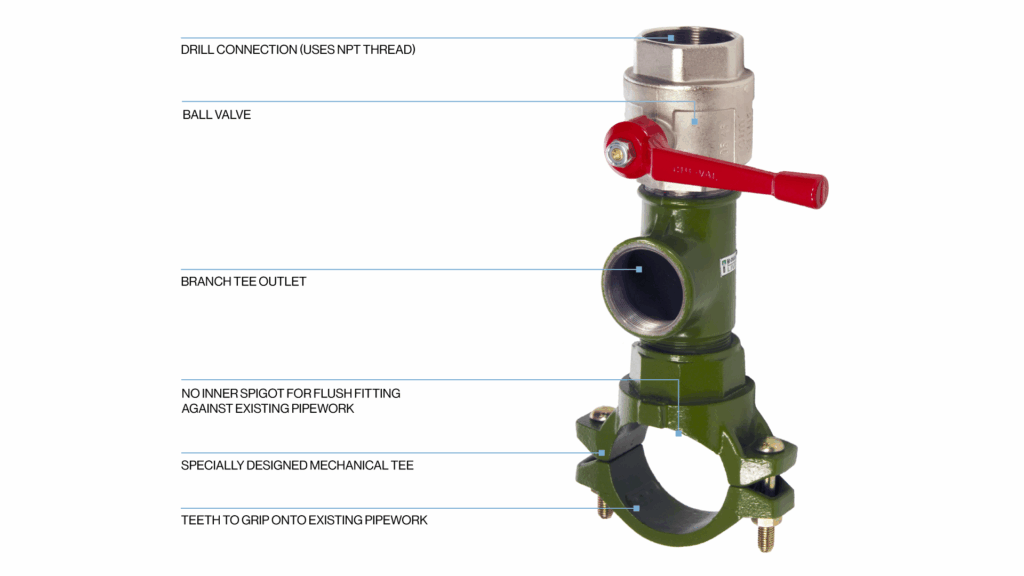 Specially designed mechanical tee engineered to provide a branch tee outlet without an in-line valve. Allows the ‘live’ installation of additional sprinklers. Available in a wide range of pipe sizes.