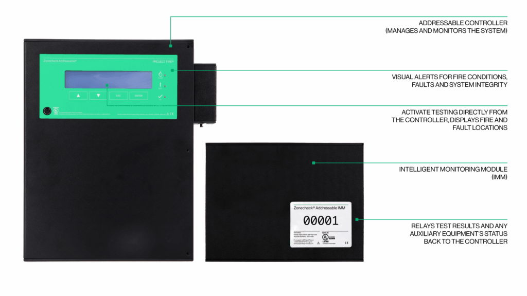 Zonecheck Addressable is a Zonecheck which is controlled and monitored via a central controller specifically designed by Project Fire. The Zonecheck unit (comprised of flow-switch, circulating pump and test line), is wired to an IMM (intelligent monitoring module) instead of the key-switch which can be found on non-addressable versions. The IMMs are linked to a Zonecheck Addressable Controller where all testing, monitoring and record keeping for flow-switch testing and more can be achieved from one central location.